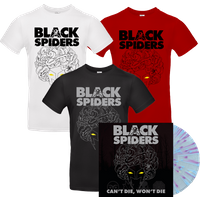 Available with Vinyl records London. Signed Merchandise Band Merchandise Black Spiders With Since reassembling Avengersstyle though probably more Suicide Squad in 2020, Black Spiders have made a compelling case for heavy guitar music from the sin city streets – revelling in the glories of the genre, its sacred lore, with a topshelf collection of riffs, a sly dash of humour, plus an iconic logo that sits alongside the best. It’ s a cocktail fans have come to savour, and it’ s here in doublemeasure on the UK outfit’ s latest fourth studio album, ‘Can’ t Die, Won’ t Die’ – 42 minutes of backstreet trouble, produced by regular studio compadre, Matt Elliss, and featuring lead single video ‘Hot Wheels’ – a tussle between riffs an’ hooks. In support of their studio albums the most recent of which hit the No. 7 spot on the UK Independent Albums chart , plus a fistful of EPs, Black Spiders have toured with the likes of Volbeat, Danzig, Airbourne and Monster Magnet, and appeared at all of the UK’ s leading festivals, including Download, Sonisphere and Bloodstock.Noted for their rousing rock ‘n’ roll slogans “EAT THUNDER, SHIT LIGHTNING”, the Spiders are the perfect lowslung machine to clench a tattooed fist to, and ‘Can’ t Die, Won’ t Die’ “A party album from top to tail, every track a banger” – frontman Pete Spiby is sure to add more burnt tread to their tyres, as they look to spend much of 2023 out on the road.1. Intro2. Hot Wheels3. Driving My Rooster4. Destroyer5. Alright Alright Alright6. Traitors Walk7. It Is What It Is8. Strange9. Another Weekend10. Make Me Bleed11. A Rat Is A Rat12. End Of The WorldOfficial Black Spiders Merchandise.Choice of colour as well as size above.