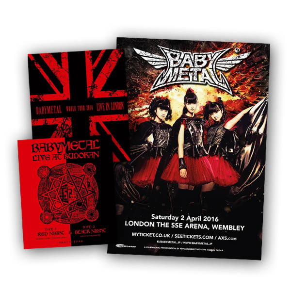 Available with Vinyl records London. Merchandise Band Merchandise Babymetal Bundle Includes Live At Budokan Red Night & Black Night Apocalypse BluRay Live In London Babymetal World Tour 2014 BluRay A4 Print